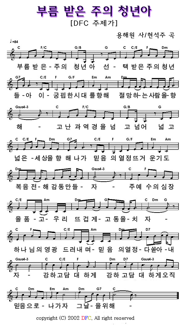 DFC 주제찬양 "부름받은 주의 청년아" 악보